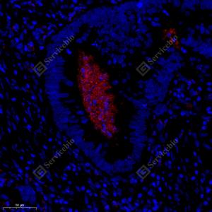 IF检测Creatine kinase MT蛋白(货号 GB114800)(红色). 样品: 人结肠癌, 4%多聚甲醛 (货号G1101) 固定12-24小时. 抗原修复: Tris-EDTA抗原修复液(pH 9.0) (G1203), 98℃, 20分钟. 封闭: 3% BSA(货号GC305010)的PBS溶液, 室温孵育30分钟. —抗: 1: 300稀释, 4℃ 孵育过夜. 二抗: Cy3标记山羊抗兔IgG (H+L) (货号GB21303), 1: 300稀释, 室温孵育1小时. |