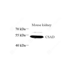 WB检测CSAD/CSD蛋白(货号 GB115081). 样品: 经RIPA裂解液(货号G2002)处理的蛋白质. 封闭: 封闭: 3%脱脂牛奶(货号GC310001)溶于TBST溶液, 室温孵育1小时. —抗: 1: 1000稀释, 4℃ 孵育过夜. 二抗: HRP标记山羊抗兔IgG (H+L) (货号GB23303), 1: 5000稀释, 室温孵育1小时. |