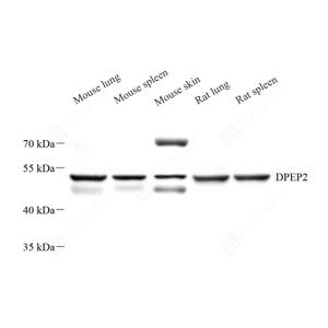 WB检测DPEP2蛋白(货号 GB115335). 样品: 经RIPA裂解液(货号G2002)处理的蛋白质. 封闭: 封闭: 3%脱脂牛奶(货号GC310001)溶于TBST溶液, 室温孵育1小时. —抗: 1: 2000稀释, 4℃ 孵育过夜. 二抗: HRP标记山羊抗兔IgG (H+L) (货号GB23303), 1: 5000稀释, 室温孵育1小时. |