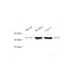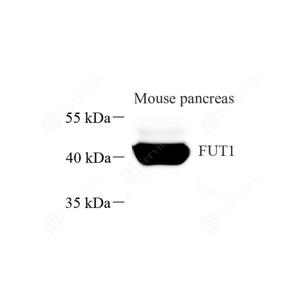 WB检测FUT1蛋白(货号 GB115002). 样品: 经RIPA裂解液(货号G2002)处理的蛋白质. 封闭: 封闭: 3%脱脂牛奶(货号GC310001)溶于TBST溶液, 室温孵育1小时. —抗: 1: 3000稀释, 4℃ 孵育过夜. 二抗: HRP标记山羊抗兔IgG (H+L) (货号GB23303), 1: 5000稀释, 室温孵育1小时. |