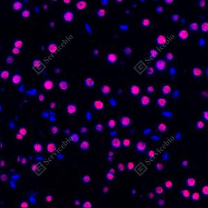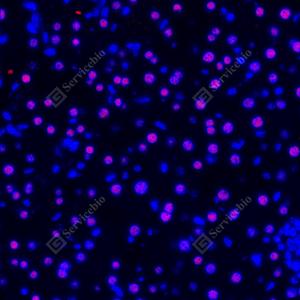 IF检测GCKR蛋白(货号 GB113849)(红色). 样品: 大鼠肝, 4%多聚甲醛 (货号G1101) 固定12-24小时. 抗原修复: Tris-EDTA抗原修复液(pH 9.0) (G1203), 98℃, 20分钟. 封闭: 3% BSA(货号GC305010)的PBS溶液, 室温孵育30分钟. —抗: 1: 1000稀释, 4℃ 孵育过夜. 二抗: Cy3标记山羊抗兔IgG (H+L) (货号GB21303), 1: 300稀释, 室温孵育1小时. |