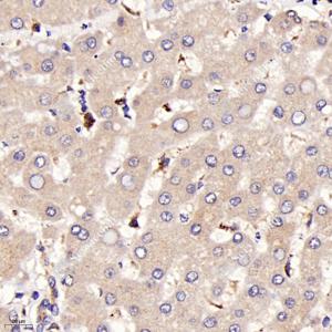 IHC检测GILT蛋白(货号 GB114228). 样品: 人肝, 4%多聚甲醛 (货号G1101) 固定12-24小时. 抗原修复: 柠檬酸抗原修复液(干粉, pH 6.0) (G1201), 98℃, 20分钟. —抗: 1: 3000稀释, 4℃ 孵育过夜. 二抗: HRP标记山羊抗兔IgG (H+L) (货号GB23303), 1: 200稀释, 室温孵育1小时. |
