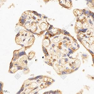 IHC检测GILT蛋白(货号 GB114228). 样品: 人胎盘, 4%多聚甲醛 (货号G1101) 固定12-24小时. 抗原修复: 柠檬酸抗原修复液(干粉, pH 6.0) (G1201), 98℃, 20分钟. —抗: 1: 3000稀释, 4℃ 孵育过夜. 二抗: HRP标记山羊抗兔IgG (H+L) (货号GB23303), 1: 200稀释, 室温孵育1小时. |