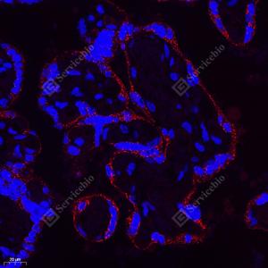IF检测GILT蛋白(货号 GB114228)(红色). 样品: 人胎盘, 4%多聚甲醛 (货号G1101) 固定12-24小时. 抗原修复: Tris-EDTA抗原修复液(pH 9.0) (G1203), 98℃, 20分钟. 封闭: 3% BSA(货号GC305010)的PBS溶液, 室温孵育30分钟. —抗: 1: 1000稀释, 4℃ 孵育过夜. 二抗: Cy3标记山羊抗兔IgG (H+L) (货号GB21303), 1: 300稀释, 室温孵育1小时. |