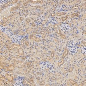 IHC检测GPAT-3蛋白(货号 GB115183). 样品: 小鼠肾, 4%多聚甲醛 (货号G1101) 固定12-24小时. 抗原修复: Tris-EDTA抗原修复液(pH 9.0) (G1203), 98℃, 20分钟. —抗: 1: 800稀释, 4℃ 孵育过夜. 二抗: HRP标记山羊抗兔IgG (H+L) (货号GB23303), 1: 200稀释, 室温孵育1小时. |