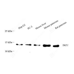 WB检测ISCU蛋白(货号 GB114213). 样品: 经RIPA裂解液(货号G2002)处理的蛋白质. 封闭: 封闭: 3%脱脂牛奶(货号GC310001)溶于TBST溶液, 室温孵育1小时. —抗: 1: 1000稀释, 4℃ 孵育过夜. 二抗: HRP标记山羊抗兔IgG (H+L) (货号GB23303), 1: 5000稀释, 室温孵育1小时. |