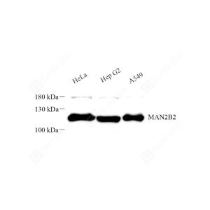 WB检测MAN2B2蛋白(货号 GB114119). 样品: 经RIPA裂解液(货号G2002)处理的蛋白质. 封闭: 封闭: 3%脱脂牛奶(货号GC310001)溶于TBST溶液, 室温孵育1小时. —抗: 1: 1000稀释, 4℃ 孵育过夜. 二抗: HRP标记山羊抗兔IgG (H+L) (货号GB23303), 1: 5000稀释, 室温孵育1小时. |