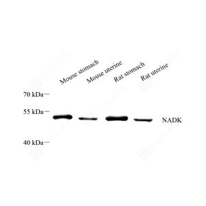 WB检测NADK蛋白(货号 GB114204). 样品: 经RIPA裂解液(货号G2002)处理的蛋白质. 封闭: 封闭: 3%脱脂牛奶(货号GC310001)溶于TBST溶液, 室温孵育1小时. —抗: 1: 1000稀释, 4℃ 孵育过夜. 二抗: HRP标记山羊抗兔IgG (H+L) (货号GB23303), 1: 5000稀释, 室温孵育1小时. |