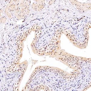 IHC检测NUDT22蛋白(货号 GB112693). 样品: 大鼠膀胱, 4%多聚甲醛 (货号G1101) 固定12-24小时. 抗原修复: Tris-EDTA抗原修复液(pH 9.0) (G1203), 98℃, 20分钟. —抗: 1: 3600稀释, 4℃ 孵育过夜. 二抗: HRP标记山羊抗兔IgG (H+L) (货号GB23303), 1: 200稀释, 室温孵育1小时. |