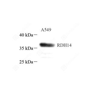 WB检测RDH14蛋白(货号 GB115071). 样品: 经RIPA裂解液(货号G2002)处理的蛋白质. 封闭: 封闭: 3%脱脂牛奶(货号GC310001)溶于TBST溶液, 室温孵育1小时. —抗: 1: 1000稀释, 4℃ 孵育过夜. 二抗: HRP标记山羊抗兔IgG (H+L) (货号GB23303), 1: 5000稀释, 室温孵育1小时. |