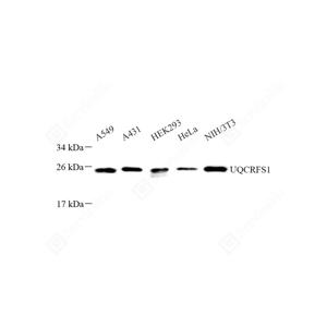WB检测UQCRFS1/RISP蛋白(货号 GB112567). 样品: 经RIPA裂解液(货号G2002)处理的蛋白质. 封闭: 封闭: 3%脱脂牛奶(货号GC310001)溶于TBST溶液, 室温孵育1小时. —抗: 1: 2000稀释, 4℃ 孵育过夜. 二抗: HRP标记山羊抗兔IgG (H+L) (货号GB23303), 1: 5000稀释, 室温孵育1小时. |