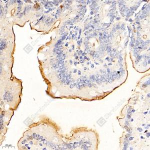 IHC检测ADCY4蛋白(货号 GB112265). 样品: 小鼠十二指肠, 4%多聚甲醛 (货号G1101) 固定12-24小时. 抗原修复: 柠檬酸抗原修复液(干粉, pH 6.0) (G1201), 98℃, 20分钟. —抗: 1: 700稀释, 4℃ 孵育过夜. 二抗: HRP标记山羊抗兔IgG (H+L) (货号GB23303), 1: 200稀释, 室温孵育1小时. |