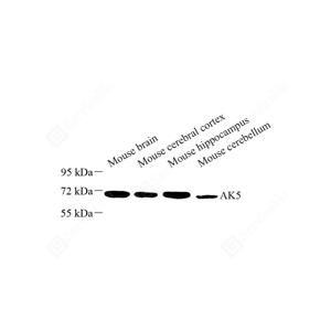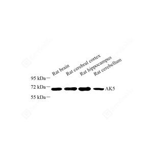 WB检测AK5蛋白(货号 GB111732). 样品: 经RIPA裂解液(货号G2002)处理的蛋白质. 封闭: 封闭: 3%脱脂牛奶(货号GC310001)溶于TBST溶液, 室温孵育1小时. —抗: 1: 500稀释, 4℃ 孵育过夜. 二抗: HRP标记山羊抗兔IgG (H+L) (货号GB23303), 1: 5000稀释, 室温孵育1小时. |