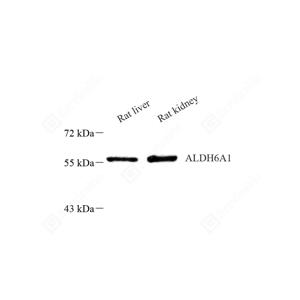 WB检测ALDH6A1蛋白(货号 GB113786). 样品: 经RIPA裂解液(货号G2002)处理的蛋白质. 封闭: 封闭: 3%脱脂牛奶(货号GC310001)溶于TBST溶液, 室温孵育1小时. —抗: 1: 1000稀释, 4℃ 孵育过夜. 二抗: HRP标记山羊抗兔IgG (H+L) (货号GB23303), 1: 5000稀释, 室温孵育1小时. |
