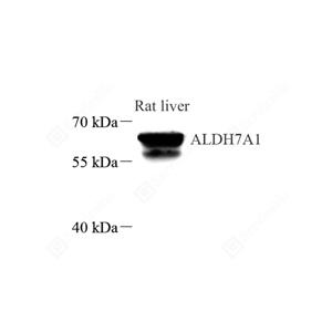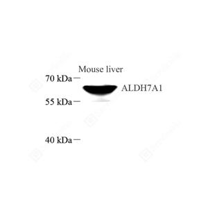 WB检测ALDH7A1蛋白(货号 GB114346). 样品: 经RIPA裂解液(货号G2002)处理的蛋白质. 封闭: 封闭: 3%脱脂牛奶(货号GC310001)溶于TBST溶液, 室温孵育1小时. —抗: 1: 2000稀释, 4℃ 孵育过夜. 二抗: HRP标记山羊抗兔IgG (H+L) (货号GB23303), 1: 5000稀释, 室温孵育1小时. |