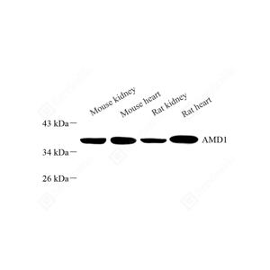 WB检测AMD1蛋白(货号 GB112127). 样品: 经RIPA裂解液(货号G2002)处理的蛋白质. 封闭: 封闭: 3%脱脂牛奶(货号GC310001)溶于TBST溶液, 室温孵育1小时. —抗: 1: 500稀释, 4℃ 孵育过夜. 二抗: HRP标记山羊抗兔IgG (H+L) (货号GB23303), 1: 5000稀释, 室温孵育1小时. |