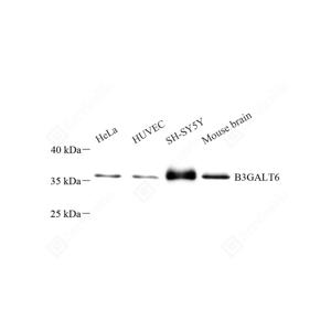WB检测B3GALT6蛋白(货号 GB114622). 样品: 经RIPA裂解液(货号G2002)处理的蛋白质. 封闭: 封闭: 3%脱脂牛奶(货号GC310001)溶于TBST溶液, 室温孵育1小时. —抗: 1: 800稀释, 4℃ 孵育过夜. 二抗: HRP标记山羊抗兔IgG (H+L) (货号GB23303), 1: 5000稀释, 室温孵育1小时. |