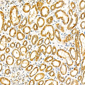IHC检测COQ7蛋白(货号 GB113937). 样品: 人肾, 4%多聚甲醛 (货号G1101) 固定12-24小时. 抗原修复: 柠檬酸抗原修复液(干粉, pH 6.0) (G1201), 98℃, 20分钟. —抗: 1: 300稀释, 4℃ 孵育过夜. 二抗: HRP标记山羊抗兔IgG (H+L) (货号GB23303), 1: 200稀释, 室温孵育1小时. |