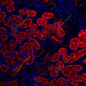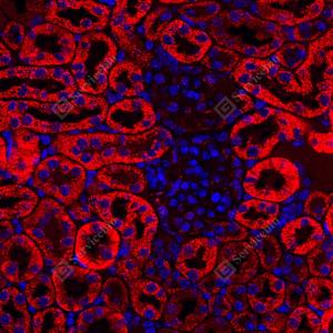 IF检测COQ7蛋白(货号 GB113937)(红色). 样品: 人肾, 4%多聚甲醛 (货号G1101) 固定12-24小时. 抗原修复: Tris-EDTA抗原修复液(pH 9.0) (G1203), 98℃, 20分钟. 封闭: 3% BSA(货号GC305010)的PBS溶液, 室温孵育30分钟. —抗: 1: 300稀释, 4℃ 孵育过夜. 二抗: Cy3标记山羊抗兔IgG (H+L) (货号GB21303), 1: 300稀释, 室温孵育1小时. |