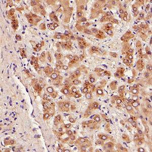 IHC检测DHTKD1蛋白(货号 GB115361). 样品: 人肝, 4%多聚甲醛 (货号G1101) 固定12-24小时. 抗原修复: Tris-EDTA抗原修复液(pH 9.0) (G1203), 98℃, 20分钟. —抗: 1: 800稀释, 4℃ 孵育过夜. 二抗: HRP标记山羊抗兔IgG (H+L) (货号GB23303), 1: 200稀释, 室温孵育1小时. |