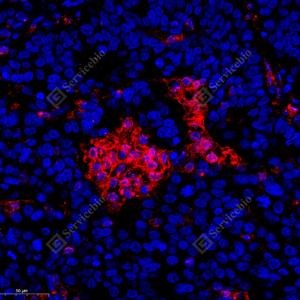 IF检测FLJ22167蛋白(货号 GB112792)(红色). 样品: 人卵巢癌, 4%多聚甲醛 (货号G1101) 固定12-24小时. 抗原修复: Tris-EDTA抗原修复液(pH 9.0) (G1203), 98℃, 20分钟. 封闭: 3% BSA(货号GC305010)的PBS溶液, 室温孵育30分钟. —抗: 1: 700稀释, 4℃ 孵育过夜. 二抗: Cy3标记山羊抗兔IgG (H+L) (货号GB21303), 1: 300稀释, 室温孵育1小时. |