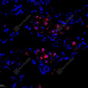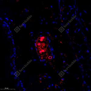 IF检测FLJ22167蛋白(货号 GB112792)(红色). 样品: 小鼠耳, 4%多聚甲醛 (货号G1101) 固定12-24小时. 抗原修复: Tris-EDTA抗原修复液(pH 9.0) (G1203), 98℃, 20分钟. 封闭: 3% BSA(货号GC305010)的PBS溶液, 室温孵育30分钟. —抗: 1: 2200稀释, 4℃ 孵育过夜. 二抗: Cy3标记山羊抗兔IgG (H+L) (货号GB21303), 1: 300稀释, 室温孵育1小时. |
