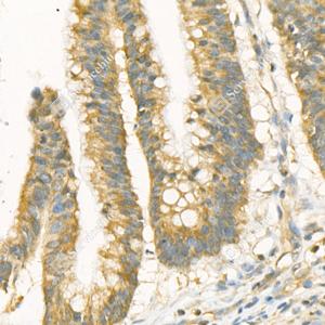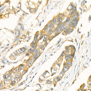 IHC检测FPGT蛋白(货号 GB114448). 样品: 人结肠癌, 4%多聚甲醛 (货号G1101) 固定12-24小时. 抗原修复: 柠檬酸抗原修复液(干粉, pH 6.0) (G1201), 98℃, 20分钟. —抗: 1: 3000稀释, 4℃ 孵育过夜. 二抗: HRP标记山羊抗兔IgG (H+L) (货号GB23303), 1: 200稀释, 室温孵育1小时. |