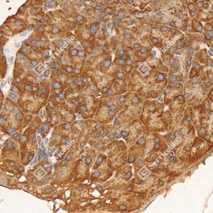 IHC检测GLTPD2蛋白(货号 GB114222). 样品: 小鼠肝, 4%多聚甲醛 (货号G1101) 固定12-24小时. 抗原修复: 柠檬酸抗原修复液(干粉, pH 6.0) (G1201), 高压锅均匀喷气计时2分钟. —抗: 1: 500稀释, 4℃ 孵育过夜. 二抗: HRP标记山羊抗兔IgG (H+L) (货号GB23303), 1: 200稀释, 室温孵育1小时. |