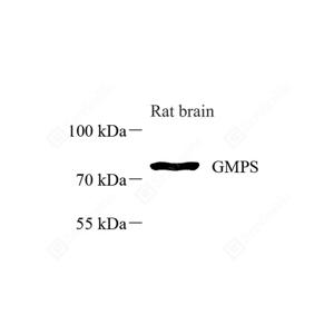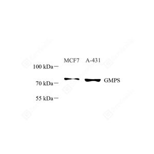 WB检测GMPS蛋白(货号 GB114798). 样品: 经RIPA裂解液(货号G2002)处理的蛋白质. 封闭: 封闭: 3%脱脂牛奶(货号GC310001)溶于TBST溶液, 室温孵育1小时. —抗: 1: 1000稀释, 4℃ 孵育过夜. 二抗: HRP标记山羊抗兔IgG (H+L) (货号GB23303), 1: 5000稀释, 室温孵育1小时. |