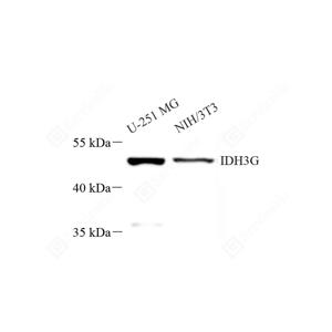 WB检测IDH3G蛋白(货号 GB114724). 样品: 经RIPA裂解液(货号G2002)处理的蛋白质. 封闭: 封闭: 3%脱脂牛奶(货号GC310001)溶于TBST溶液, 室温孵育1小时. —抗: 1: 1000稀释, 4℃ 孵育过夜. 二抗: HRP标记山羊抗兔IgG (H+L) (货号GB23303), 1: 5000稀释, 室温孵育1小时. |
