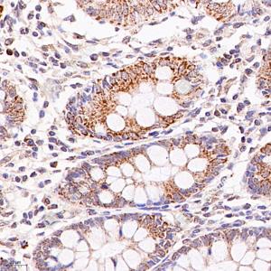 IHC检测IDH3B蛋白(货号 GB114009). 样品: 人结肠, 4%多聚甲醛 (货号G1101) 固定12-24小时. 抗原修复: 柠檬酸抗原修复液(干粉, pH 6.0) (G1201), 98℃, 20分钟. —抗: 1: 2400稀释, 4℃ 孵育过夜. 二抗: HRP标记山羊抗兔IgG (H+L) (货号GB23303), 1: 200稀释, 室温孵育1小时. |