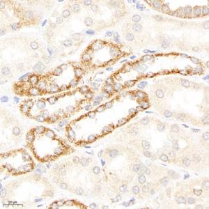 IHC检测IDH3B蛋白(货号 GB114009). 样品: 人肾, 4%多聚甲醛 (货号G1101) 固定12-24小时. 抗原修复: 柠檬酸抗原修复液(干粉, pH 6.0) (G1201), 98℃, 20分钟. —抗: 1: 2400稀释, 4℃ 孵育过夜. 二抗: HRP标记山羊抗兔IgG (H+L) (货号GB23303), 1: 200稀释, 室温孵育1小时. |