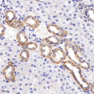 IHC检测IDH3B蛋白(货号 GB114009). 样品: 小鼠肾, 4%多聚甲醛 (货号G1101) 固定12-24小时. 抗原修复: 柠檬酸抗原修复液(干粉, pH 6.0) (G1201), 98℃, 20分钟. —抗: 1: 2400稀释, 4℃ 孵育过夜. 二抗: HRP标记山羊抗兔IgG (H+L) (货号GB23303), 1: 200稀释, 室温孵育1小时. |