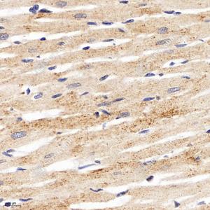 IHC检测IDH3B蛋白(货号 GB114009). 样品: 大鼠心, 4%多聚甲醛 (货号G1101) 固定12-24小时. 抗原修复: 柠檬酸抗原修复液(干粉, pH 6.0) (G1201), 98℃, 20分钟. —抗: 1: 2400稀释, 4℃ 孵育过夜. 二抗: HRP标记山羊抗兔IgG (H+L) (货号GB23303), 1: 200稀释, 室温孵育1小时. |
