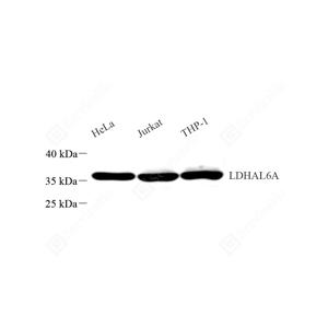 WB检测LDHA-like protein 6A蛋白(货号 GB115192). 样品: 经RIPA裂解液(货号G2002)处理的蛋白质. 封闭: 封闭: 3%脱脂牛奶(货号GC310001)溶于TBST溶液, 室温孵育1小时. —抗: 1: 2000稀释, 4℃ 孵育过夜. 二抗: HRP标记山羊抗兔IgG (H+L) (货号GB23303), 1: 5000稀释, 室温孵育1小时. |