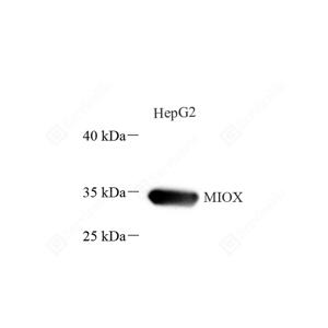 WB检测MIOX蛋白(货号 GB114095). 样品: 经RIPA裂解液(货号G2002)处理的蛋白质. 封闭: 封闭: 3%脱脂牛奶(货号GC310001)溶于TBST溶液, 室温孵育1小时. —抗: 1: 1000稀释, 4℃ 孵育过夜. 二抗: HRP标记山羊抗兔IgG (H+L) (货号GB23303), 1: 5000稀释, 室温孵育1小时. |