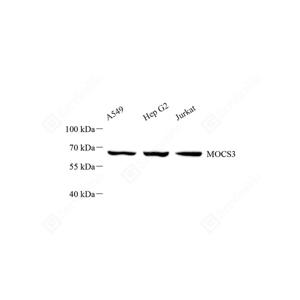 | WB检测MOCS3蛋白(货号 GB114240). 样品: 经RIPA裂解液(货号G2002)处理的蛋白质. 封闭: 封闭: 3%脱脂牛奶(货号GC310001)溶于TBST溶液, 室温孵育1小时. —抗: 1: 2000稀释, 4℃ 孵育过夜. 二抗: HRP标记山羊抗兔IgG (H+L) (货号GB23303), 1: 5000稀释, 室温孵育1小时. |
