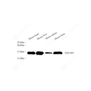 WB检测NDUFB5蛋白(货号 GB115007). 样品: 经RIPA裂解液(货号G2002)处理的蛋白质. 封闭: 封闭: 3%脱脂牛奶(货号GC310001)溶于TBST溶液, 室温孵育1小时. —抗: 1: 4000稀释, 4℃ 孵育过夜. 二抗: HRP标记山羊抗兔IgG (H+L) (货号GB23303), 1: 5000稀释, 室温孵育1小时. |