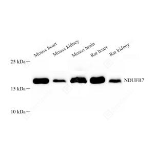 WB检测NDUFB7蛋白(货号 GB114528). 样品: 经RIPA裂解液(货号G2002)处理的蛋白质. 封闭: 3%脱脂牛奶(货号GC310001)溶于TBST溶液, 室温孵育1小时. —抗: 1: 1000稀释, 4℃ 孵育过夜. 二抗: HRP标记山羊抗兔IgG (H+L) (货号GB23303), 1: 5000稀释, 室温孵育1小时. |