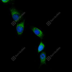 ICC检测NDUFB7蛋白(货号 GB114528)(绿色). 样品: NIH-3T3细胞, 4%多聚甲醛 (货号G1101) 固定20分钟. 封闭: 3% BSA(货号GC305010)的PBS溶液, 室温孵育30分钟. 一抗: 1: 50稀释, 4℃ 孵育过夜. 二抗: Alexa Fluor 488标记山羊抗兔IgG (H+L) (货号GB25303), 1: 400稀释, 室温孵育1小时. |