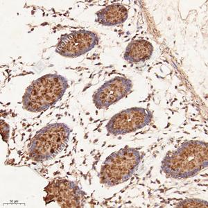 IHC检测Neutral alpha-glucosidase C蛋白(货号 GB115222). 样品: 大鼠睾丸, 4%多聚甲醛 (货号G1101) 固定12-24小时. 抗原修复: Tris-EDTA抗原修复液(pH 9.0) (G1203), 98℃, 20分钟. —抗: 1: 700稀释, 4℃ 孵育过夜. 二抗: HRP标记山羊抗兔IgG (H+L) (货号GB23303), 1: 200稀释, 室温孵育1小时. |