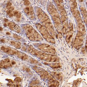 IHC检测Neutral alpha-glucosidase C蛋白(货号 GB115222). 样品: 小鼠结肠, 4%多聚甲醛 (货号G1101) 固定12-24小时. 抗原修复: Tris-EDTA抗原修复液(pH 9.0) (G1203), 98℃, 20分钟. —抗: 1: 700稀释, 4℃ 孵育过夜. 二抗: HRP标记山羊抗兔IgG (H+L) (货号GB23303), 1: 200稀释, 室温孵育1小时. |