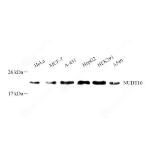 WB检测NUDT16蛋白(货号 GB112615). 样品: 经RIPA裂解液(货号G2002)处理的蛋白质. 封闭: 封闭: 3%脱脂牛奶(货号GC310001)溶于TBST溶液, 室温孵育1小时. —抗: 1: 500稀释, 4℃ 孵育过夜. 二抗: HRP标记山羊抗兔IgG (H+L) (货号GB23303), 1: 5000稀释, 室温孵育1小时. |