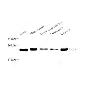 WB检测UQCC蛋白(货号 GB112595). 样品: 经RIPA裂解液(货号G2002)处理的蛋白质. 封闭: 3%脱脂牛奶(货号GC310001)溶于TBST溶液, 室温孵育1小时. —抗: 1: 500稀释, 4℃ 孵育过夜. 二抗: HRP标记山羊抗兔IgG (H+L) (货号GB23303), 1: 5000稀释, 室温孵育1小时. |