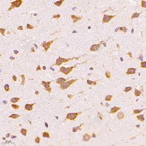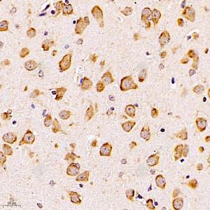 IHC检测UQCC蛋白(货号 GB112595). 样品: 大鼠脑, 4%多聚甲醛 (货号G1101) 固定12-24小时. 抗原修复: 柠檬酸抗原修复液(干粉, pH 6.0) (G1201), 98℃, 20分钟. —抗: 1: 1000稀释, 4℃ 孵育过夜. 二抗: HRP标记山羊抗兔IgG (H+L) (货号GB23303), 1: 200稀释, 室温孵育1小时. |