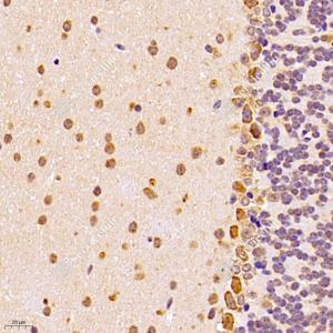 IHC检测UQCC蛋白(货号 GB112595). 样品: 小鼠小脑, 4%多聚甲醛 (货号G1101) 固定12-24小时. 抗原修复: 柠檬酸抗原修复液(干粉, pH 6.0) (G1201), 98℃, 20分钟. —抗: 1: 1000稀释, 4℃ 孵育过夜. 二抗: HRP标记山羊抗兔IgG (H+L) (货号GB23303), 1: 200稀释, 室温孵育1小时. |