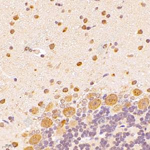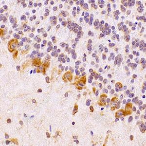 IHC检测UQCC蛋白(货号 GB112595). 样品: 大鼠小脑, 4%多聚甲醛 (货号G1101) 固定12-24小时. 抗原修复: 柠檬酸抗原修复液(干粉, pH 6.0) (G1201), 98℃, 20分钟. —抗: 1: 1000稀释, 4℃ 孵育过夜. 二抗: HRP标记山羊抗兔IgG (H+L) (货号GB23303), 1: 200稀释, 室温孵育1小时. |