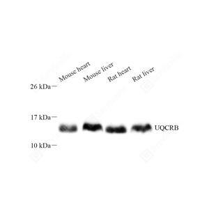 WB检测UQCRB蛋白(货号 GB112659). 样品: 经RIPA裂解液(货号G2002)处理的蛋白质. 封闭: 封闭: 3%脱脂牛奶(货号GC310001)溶于TBST溶液, 室温孵育1小时. —抗: 1: 1000稀释, 4℃ 孵育过夜. 二抗: HRP标记山羊抗兔IgG (H+L) (货号GB23303), 1: 5000稀释, 室温孵育1小时. |