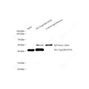 | 免疫共沉淀转染的HEK-293F细胞裂解液,使用HA标签抗体(免疫沉淀抗体:GB12939,1:100;检测抗体:GB12939,1:3000) |