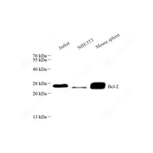 WB检测Bcl-2蛋白(货号 GB154380). 样品: 经RIPA裂解液(货号G2002)处理的蛋白质. 封闭: 3%脱脂牛奶(货号GC310001)溶于TBST溶液, 室温孵育1小时. —抗: 1: 500稀释, 4℃ 孵育过夜. 二抗: HRP标记山羊抗兔IgG (H+L) (货号GB23303), 1: 5000稀释, 室温孵育1小时. |
